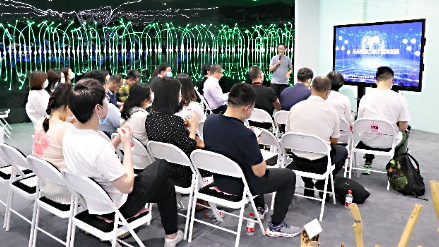 在神州信息工作人员的带领下,与会代表首先参观了公司的展厅,全面了解神州信息金融科技业务情况,并重点听取了神州信息在区块链及数字人民币相关场景研发应用的创新案例方面的介绍。