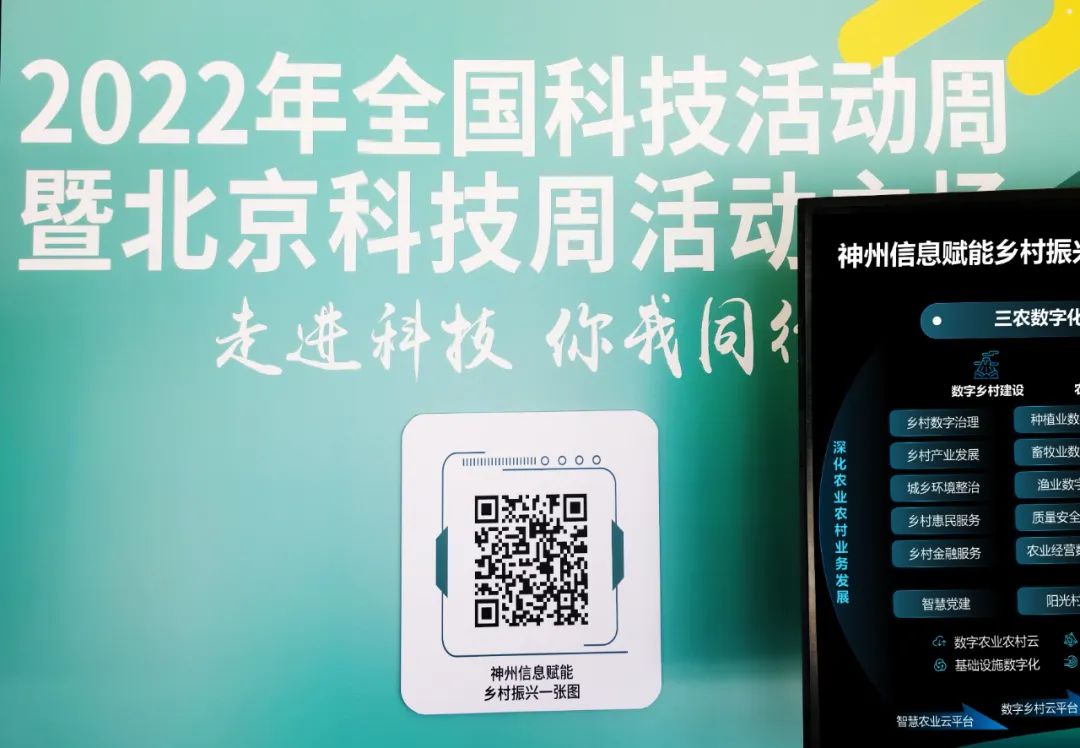 8月20日—27日,2022年全国科技活动周暨北京科技周活动将于城市绿心森林公园举办。本届北京科技周以“走进科技 你我同行”为主题,重点展示“十四五”期间北京领先科技创新成果,彰显北京建设国际科技创新中心的底气、勇气和锐气。“神州信息赋能乡村振兴一张图”入选主题展,呈现了在农业农村场景金融新模式,助力普惠金融发展方面取得的成绩。