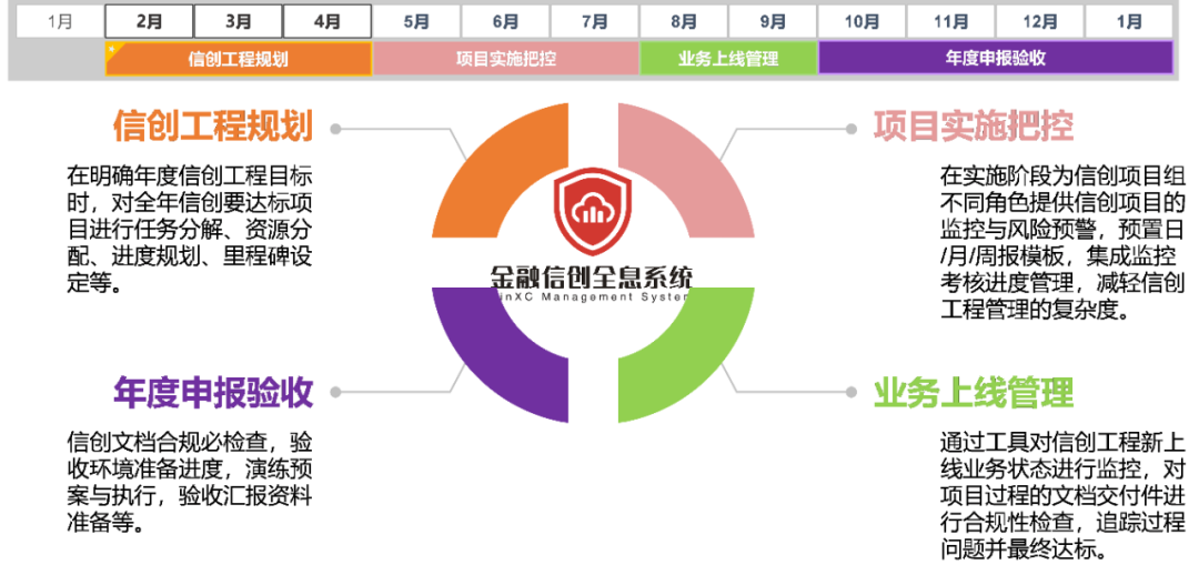 金融信创管理全息系统结合金融机构自身5-8年的信创工作整体展开,重点关注从组织建设、资金投入情况、年度任务完成度、验收资料收集与信创能力沉淀,实现金融机构的信创架构转型。