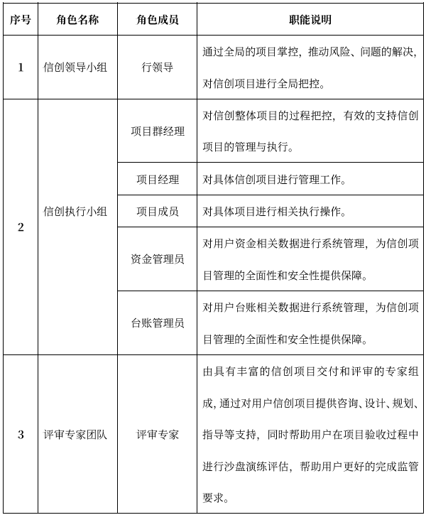 一是通过对信创领导小组、信创执行小组和评审专家团队三类角色的定义,为金融用户在全局管理、项目管理、里程碑管理、交付物管理、问题管理、报告管理等方面提供标准化支持。帮助金融用户对提交监管的上报方案、月报文件、验收交付物进行有序管理,有效推进金融信创项目的顺利达标。