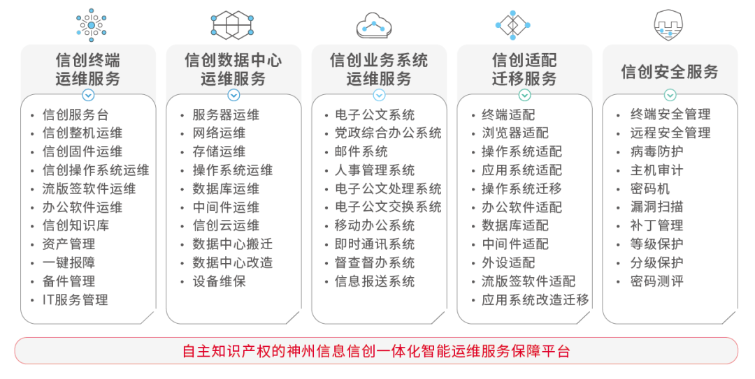 神州信息基于十多年信创服务经验,为客户提供信创终端运维服务、数据中心运维服务、业务系统运维服务、适配迁移服务、安全运维服务等信创运维服务。通过信创运维服务体系、信创安全管理体系、信创一体化服务保障平台、信创现场和远程运维服务管理平台,规范信创运维服务过程,提升信创运维服务保障能力,为客户创建可视可控的运维环境,保障信创终端、数据中心和业务应用系统的可靠、 高效、持续、安全运行。