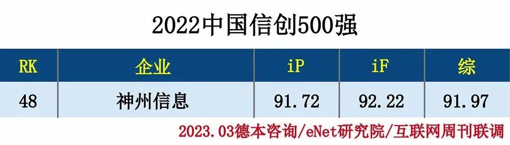 近日,中国科学院《互联网周刊》、eNet研究院、德本咨询等联合发布了2022年度中国信创500强企业名单。神州信息再度上榜,位列48位。