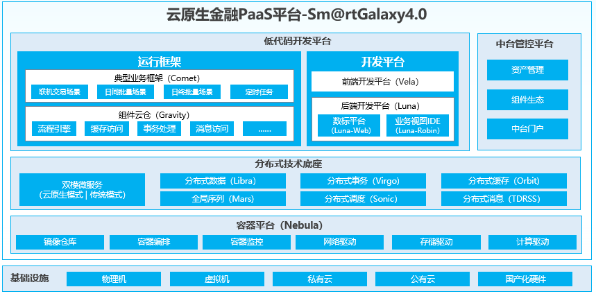 本次获奖的云原生金融PaaS平台解决方案,主要包括云原生及分布式技术底座、低代码开发平台、中台管控平台等内容,构建了集运行、运维、开发及管理的完整体系。