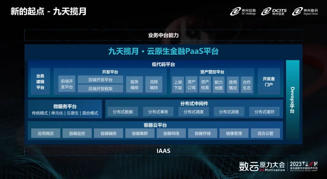 开幕式上的重磅技术发布环节,神州信息新动力数字金融研究院正式对外发布“九天揽月·云原生金融PaaS平台”(简称:九天揽月平台)。“九天揽月平台”具有“低代码、中台化、云原生”三大技术创新点,具备八大特点支撑和解决现有金融数字化转型架构平台中的主要问题。中科院院士梅宏、神州信息董事长郭为、开放原子开源基金会秘书长冯冠霖、中国互联网协会数字金融工委会执行副秘书长江艾芸等多位重量级嘉宾共同见证了“九天揽月·云原生金融PaaS平台”发布。