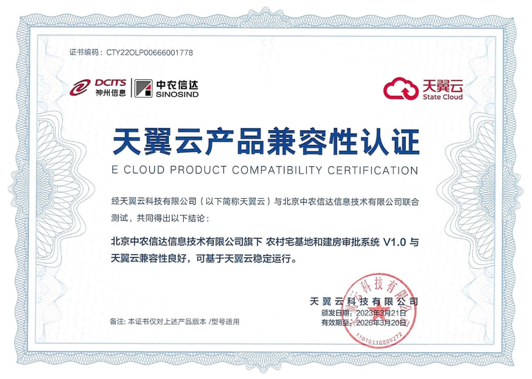 近期,神州信息与天翼云科技有限公司完成产品兼容性适配互认证。本次兼容性认证是由神州信息农村宅基地产品(农村宅基地和建房审批系统V1.0)与天翼云适配。结果显示:宅基地产品与天翼云兼容性良好,产品可在天翼云环境稳定运行,性能体验良好。满足用户对系统安全、国产化适配、自主可控等方面的要求。