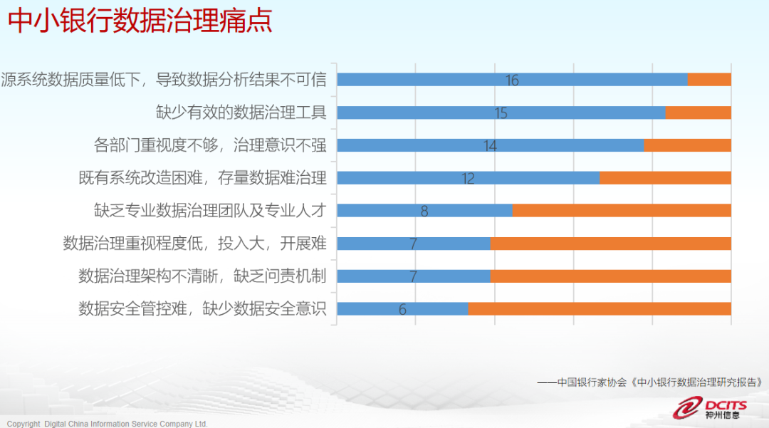 神州信息基于丰富的实战经验,对中小银行发展阶段、数据治理痛点等方面的深入分析,相比于规模和实力均处于领先地位的大型银行,中小银行的数据特征方面与大行相比存在的天然不同和挑战: