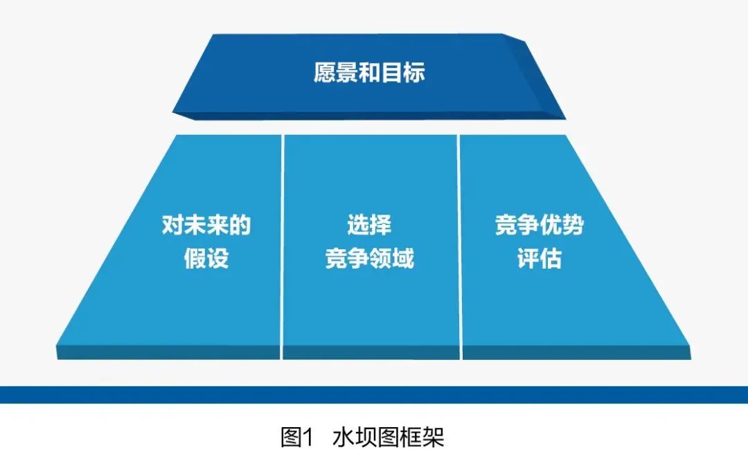 水坝图由三部分组成,最左边是对未来的假设,就是如何看待企业战略;中间是企业如何选择竞争领域;最右边是竞争优势评估,包括企业要完成怎样的战略目标,基于假设和能力,企业要弥补哪些短板,明确哪些关键举措等。